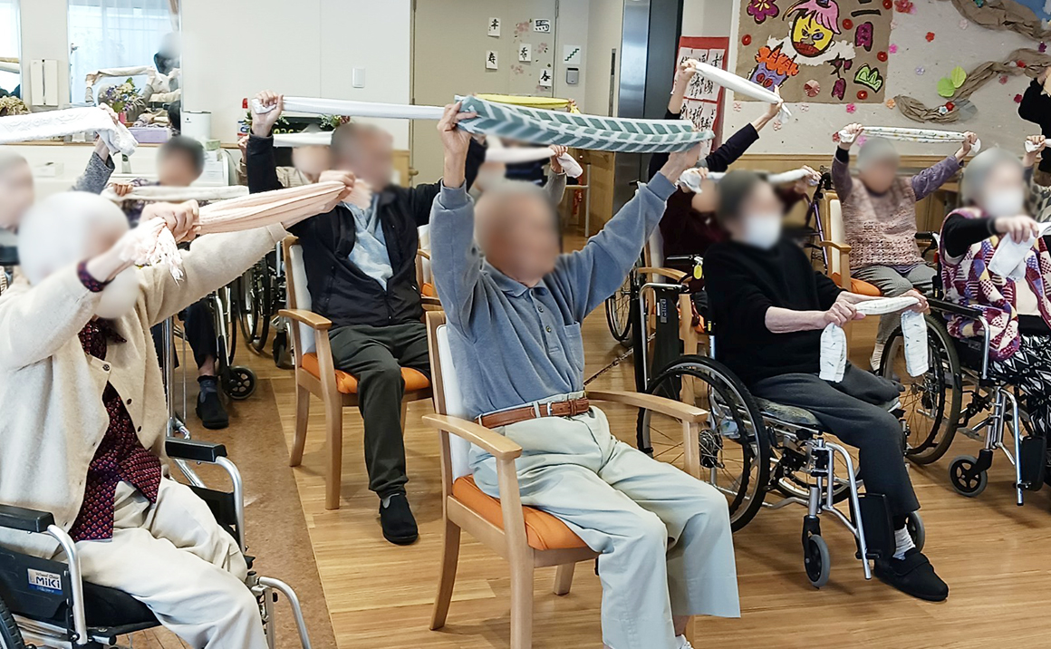 訪問マッサージの先生によるタオルを使ったリハビリ体操のようすです✨