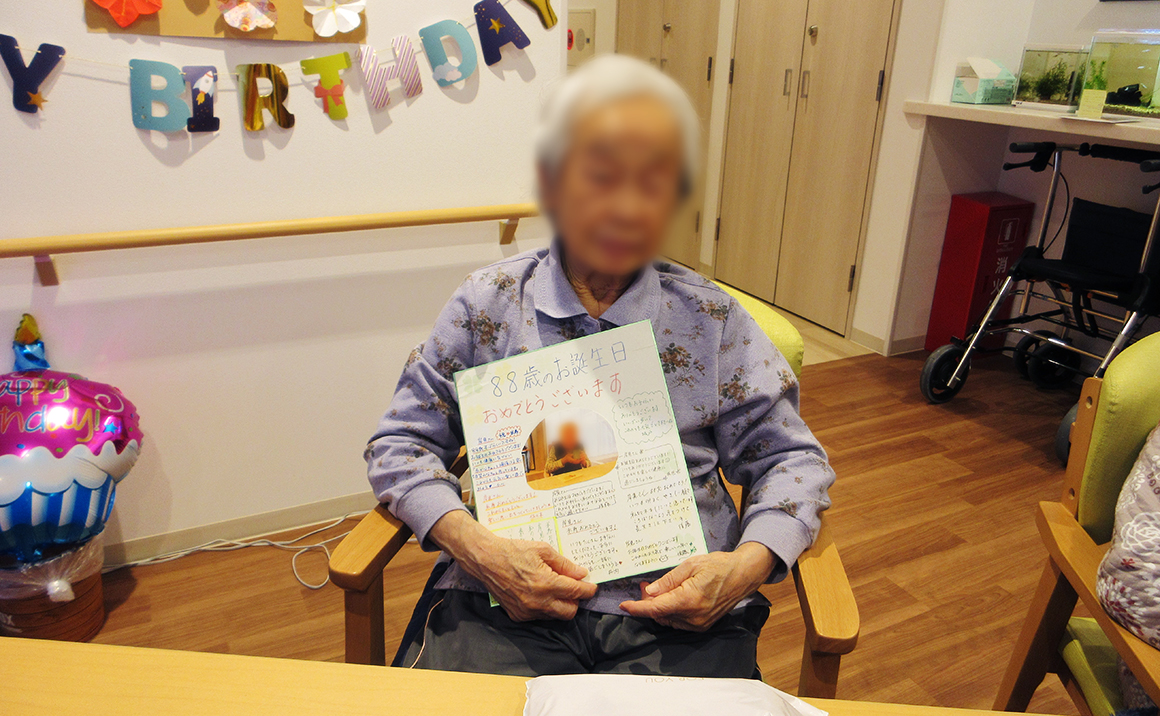 さらに、職員からのお祝いの一言を書いた色紙や入居者の方みんなで作った手作りの誕生ケーキでお祝いしました。