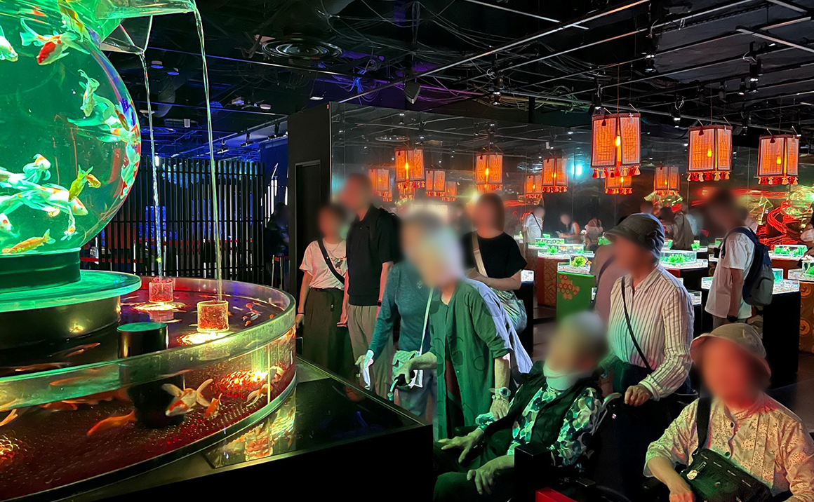 本日は銀座三越にある銀座アートアクアリウムに行って参りました。いざ中へ入ってみると光彩や音楽が美しく、とても良い香りに包まれた空間を体験することが出来ました。そんな美しい空間を泳いでいる金魚たちを見て、「とても綺麗!」「凄く綺麗で感動する」「こんな最高な体験をさせてくれてありがとう」などとても満足されたお言葉をご利用者様方から頂くことが出来ました。