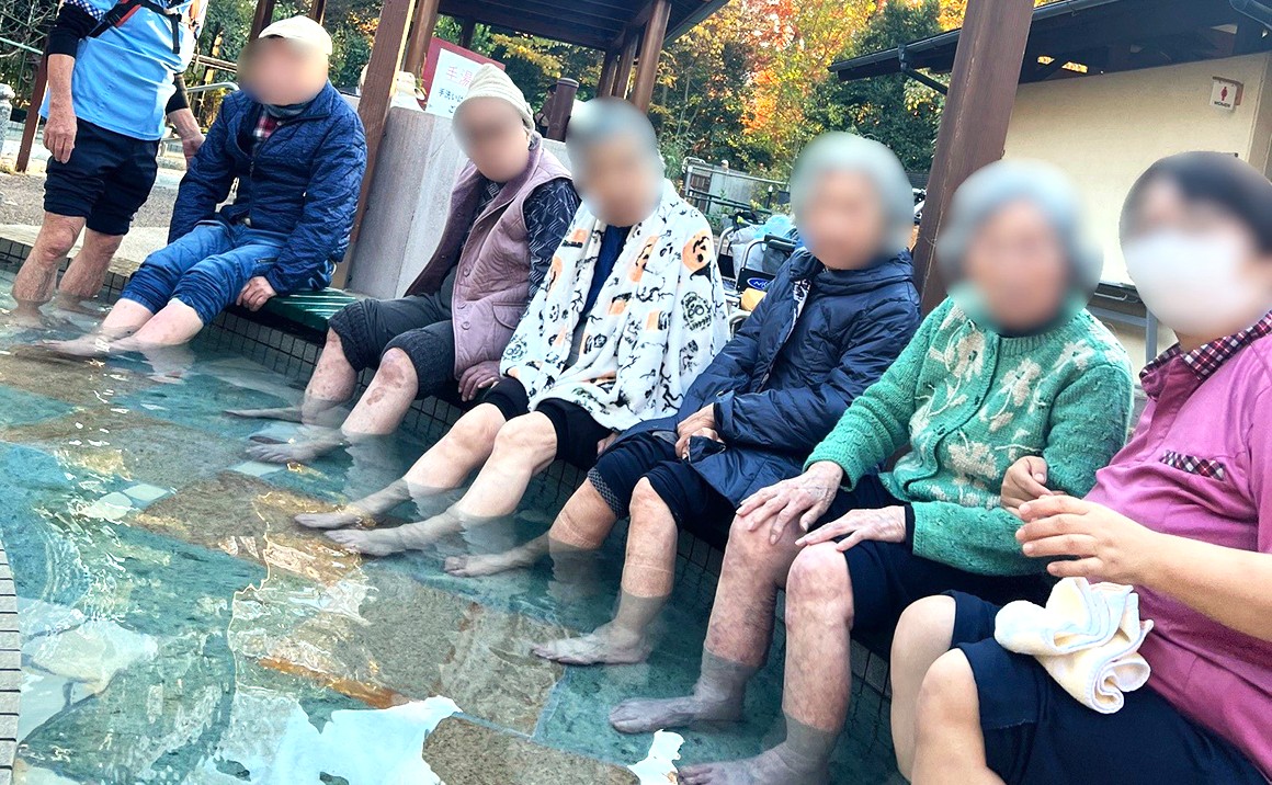 紅葉の季節になりました。紅葉も兼ねて「こもれびの足湯」に行きました。 昼食は「味の民芸」で食事し、その後移動して「こもれびの足湯」へ行きました。 3種類の内、2種類の足湯に入りました。 初めはぬるま湯⇒少し熱めの42度。皆さん気持ちよさそうに大変喜ばれました。 機会があれば。また、行ければと思います。