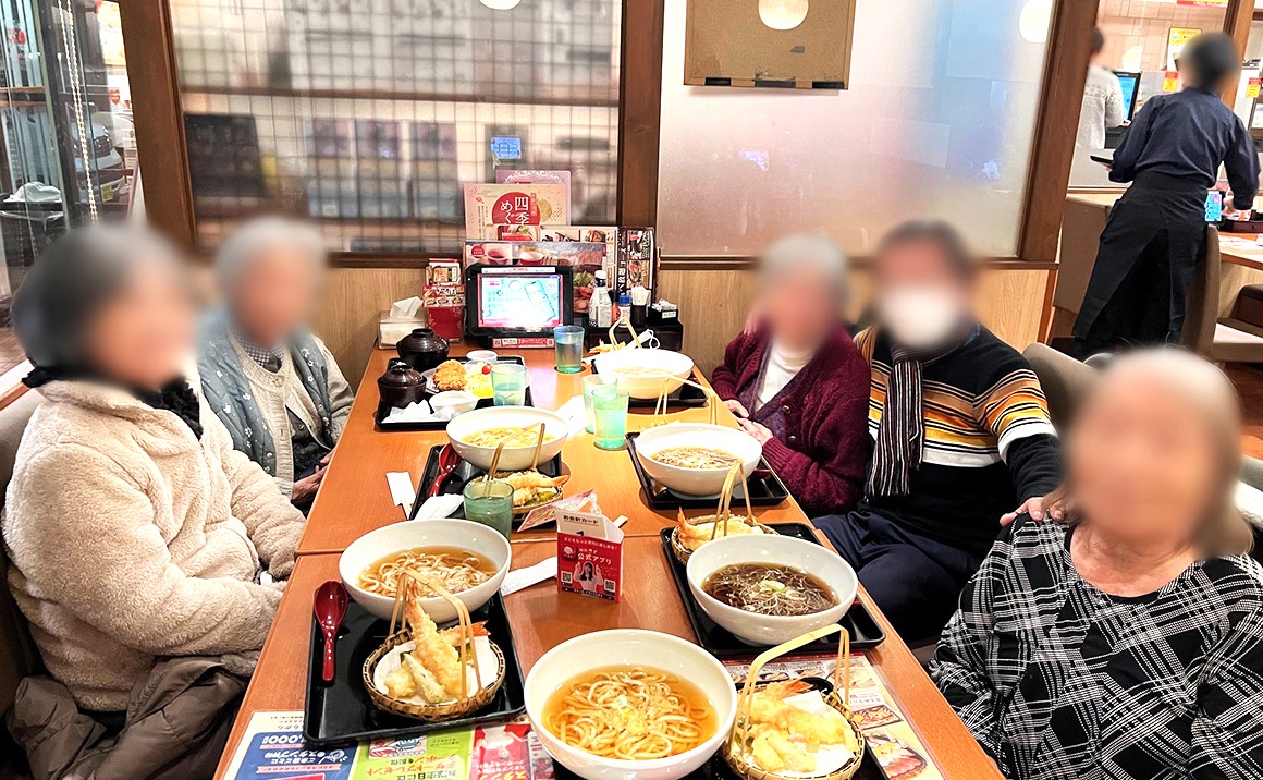 到着前に、夕食は「和食のさと」に立ち寄り、お蕎麦やうどん、天ぷらとお寿司のセットを召し上がられました。皆様おいしそうに食事をされ、ゆっくりとした夕食の時間となりました。
