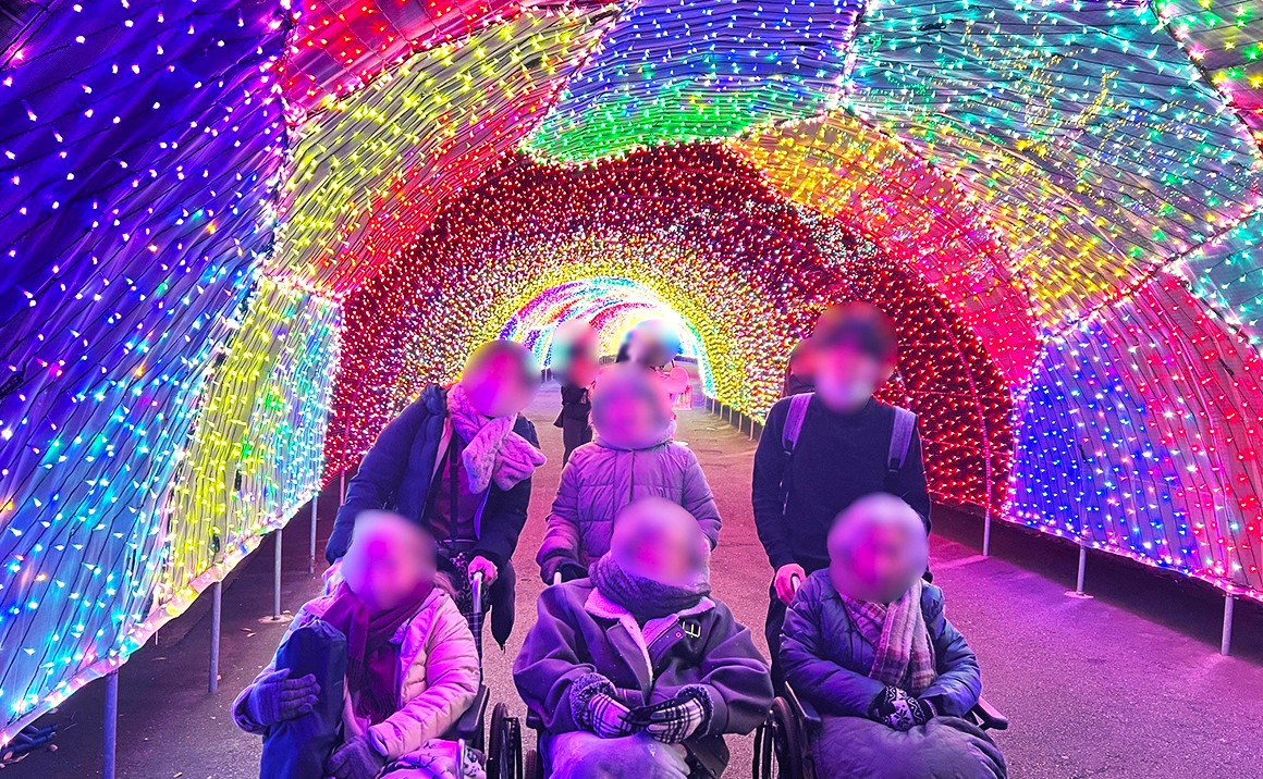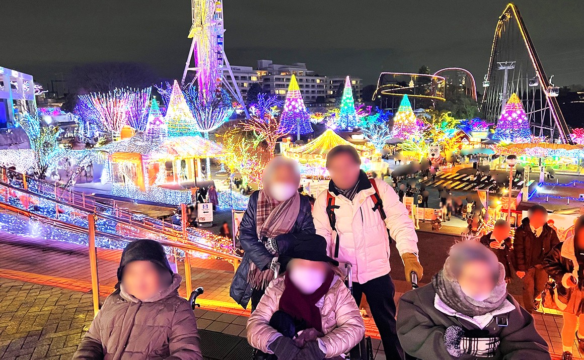 今回は利用者様4名と一緒に、よみうりランドへお出かけしました。現在、夜のイルミネーションが開催されているとのことで、皆様で楽しみにしながら向かいました。
