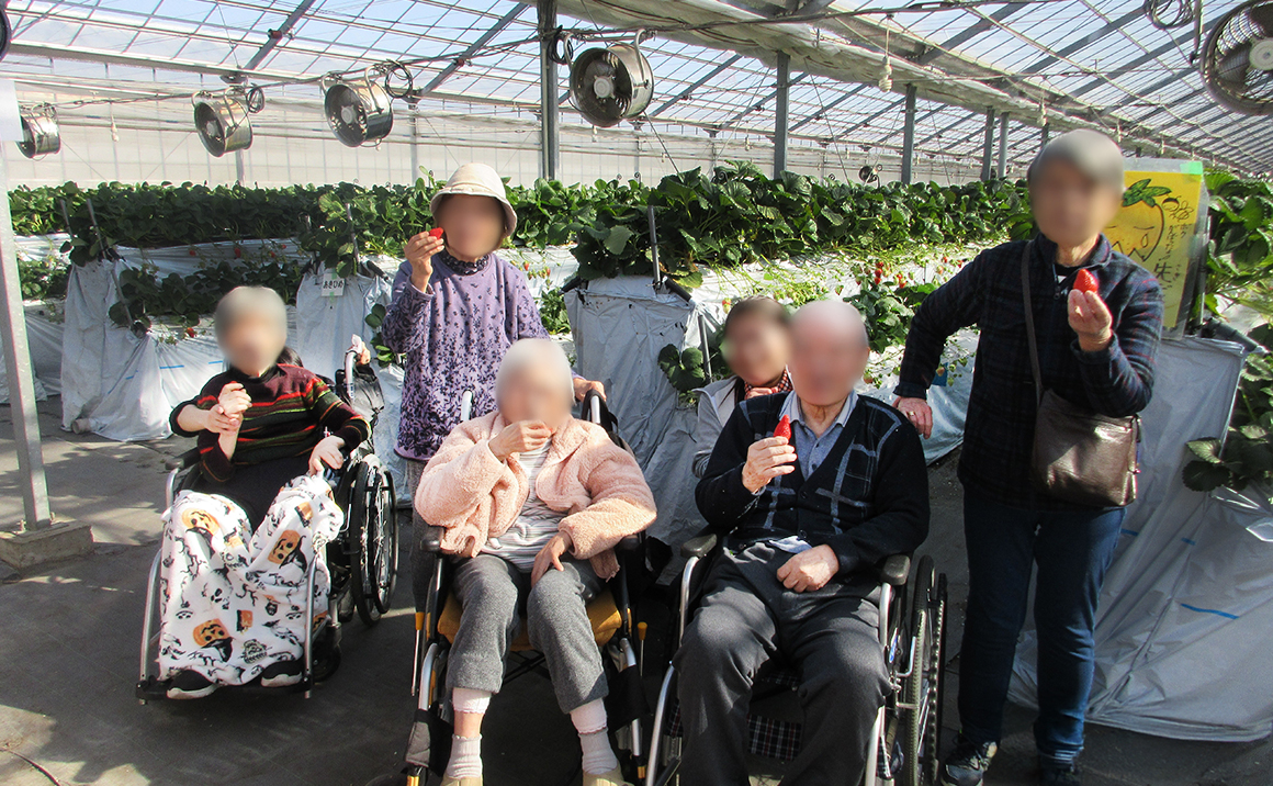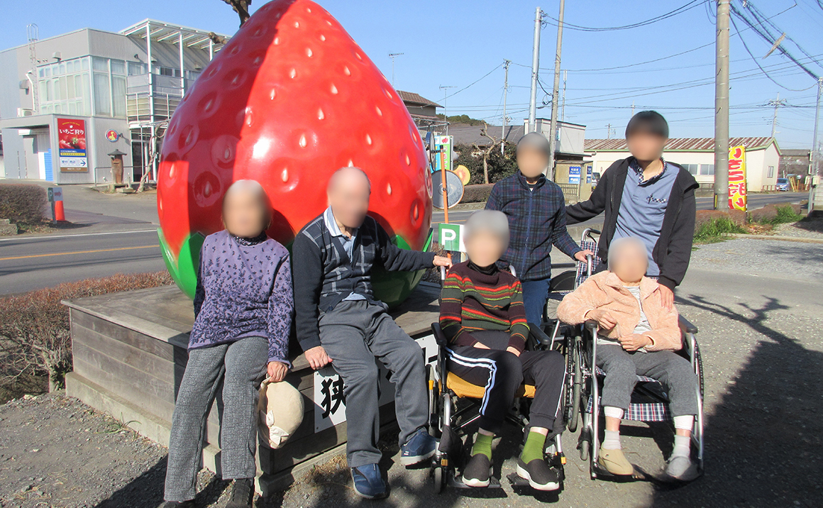 今回は利用者様5名と一緒に、狭山ベリーランドに出かけしました。この時期いちご狩りができるとのことで皆様で向かいました。