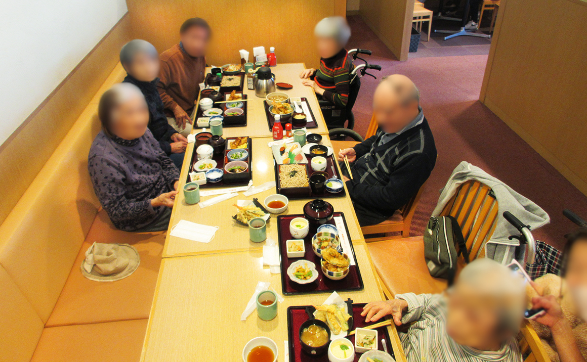お寿司や天ぷら、蕎麦などを「どれにしようか迷っちゃうね」と話されながら利用者様ご自身でお好きなメニューを選んでいただき、いちご狩りで沢山召し上がれた後でも皆様ゆっくりと味わいながら完食されました。