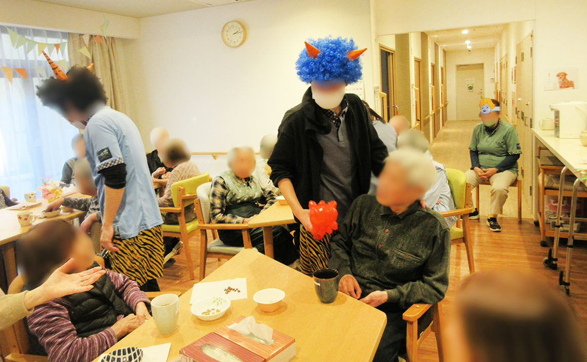 鬼の姿をしたスタッフが3人登場すると、皆様一斉に豆を投げてくださり、全力で笑顔で楽しまれておりました。
