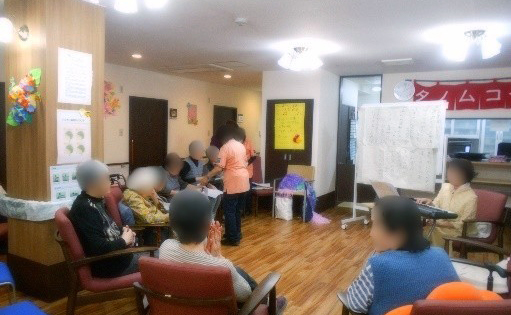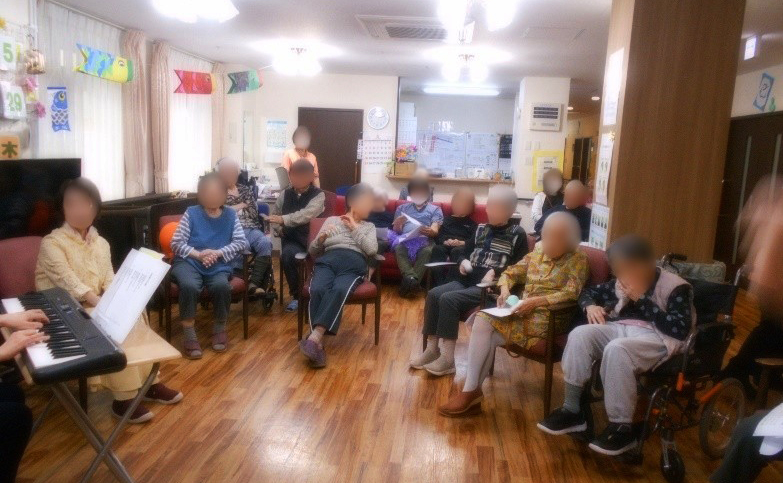ご利用者様の電子ピアノの伴奏によるコーラス発表会を行いました。 「手のひらを太陽に」を弾いていただき、それに合わせご利用者様、職員が一緒になりコーラスをしました。 その他にも「上を向いて歩こう」「ふるさと」などをコーラスし、本当に皆さん明るい笑顔と歌声でたのしいコーラスを聞かせていただきました。 これからも開催していきたいと思います。