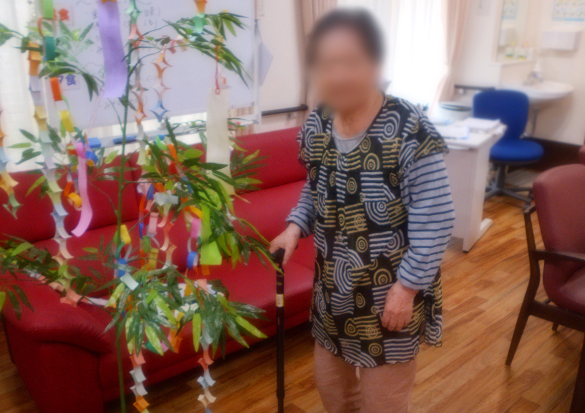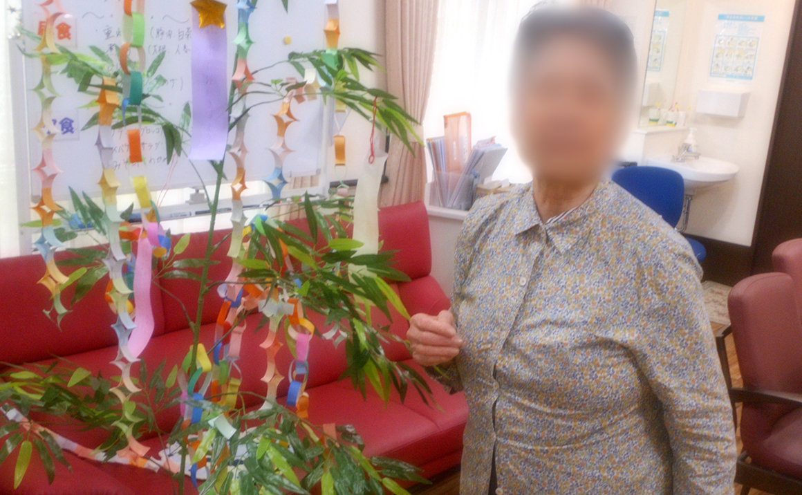 毎年、恒例の七夕の願い事を利用者様に記入していただき、一人ひとり笹に飾って頂きました。
