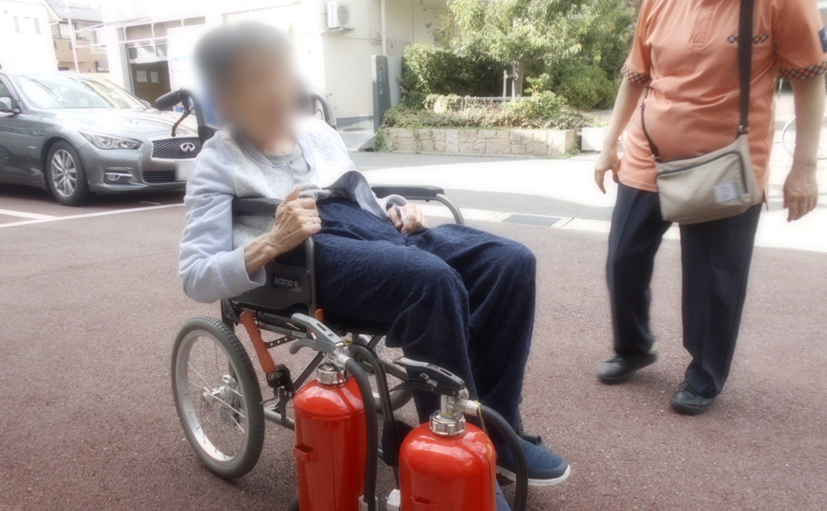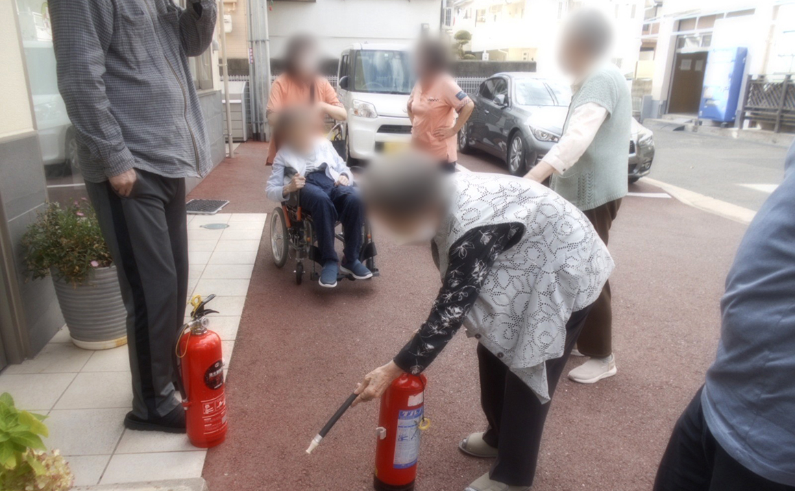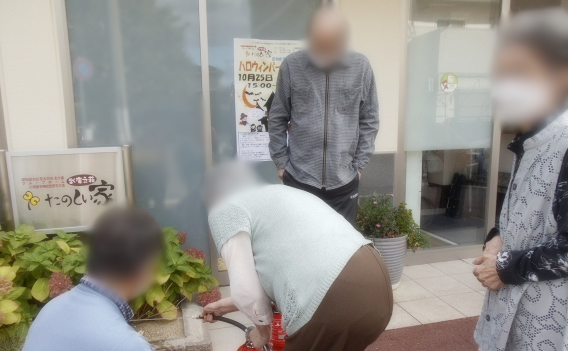 10月15日に消防訓練を行いました。 通報訓練と消防訓練、避難訓練を行い、AEDの使用方法は今回は口頭で説明を行いましたが、 年に数回繰り返し説明を行ったり、時には消防署に協力をしていただき講習会を行ったりしています。 写真は利用者様に消火訓練をしてもらった時のものです。
