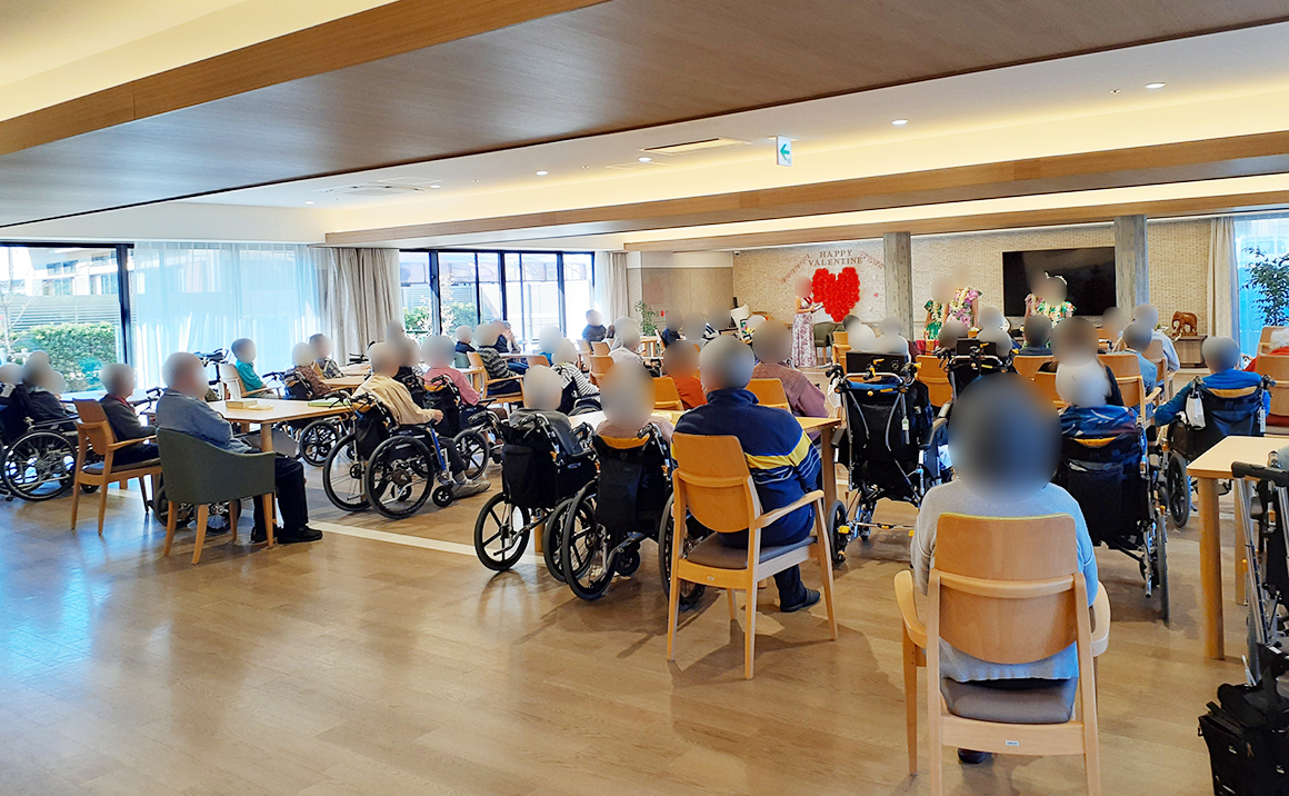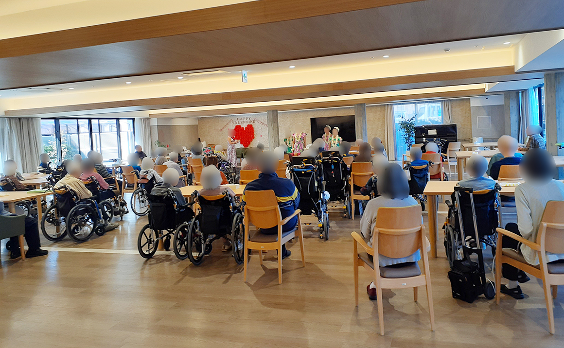 2月にフラダンスイベントがございました。 ご利用者様の教え子さんが踊って下さり、号泣されておりました。 ご利用者様の中にはフラダンスをやったことのある方が多くいらっしゃい、懐かしさで体を動かしたりと皆さん楽しまれておりました。