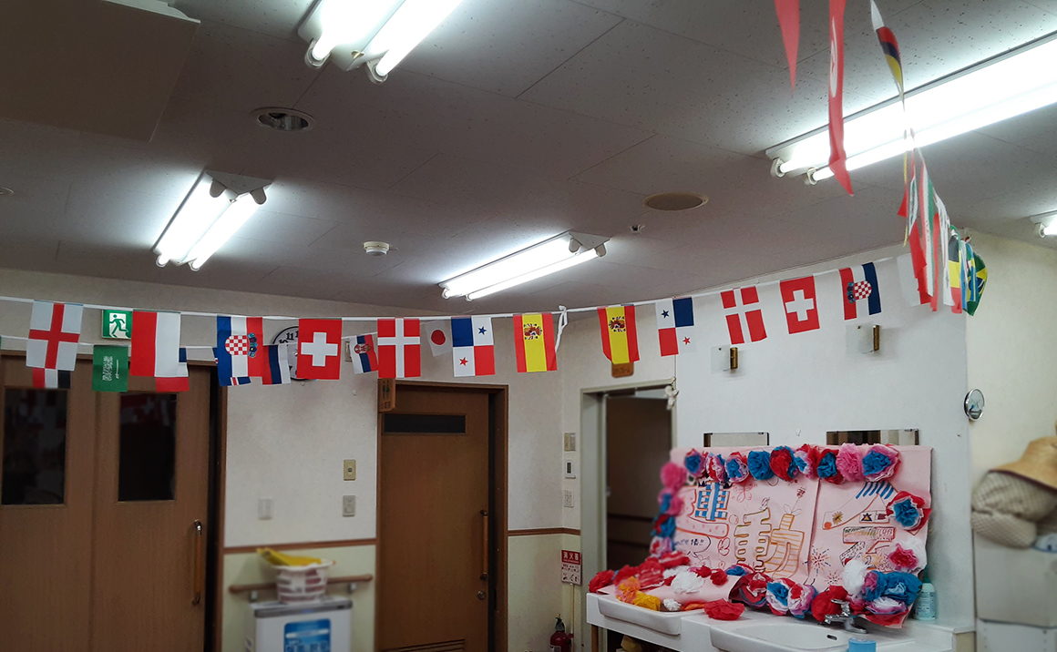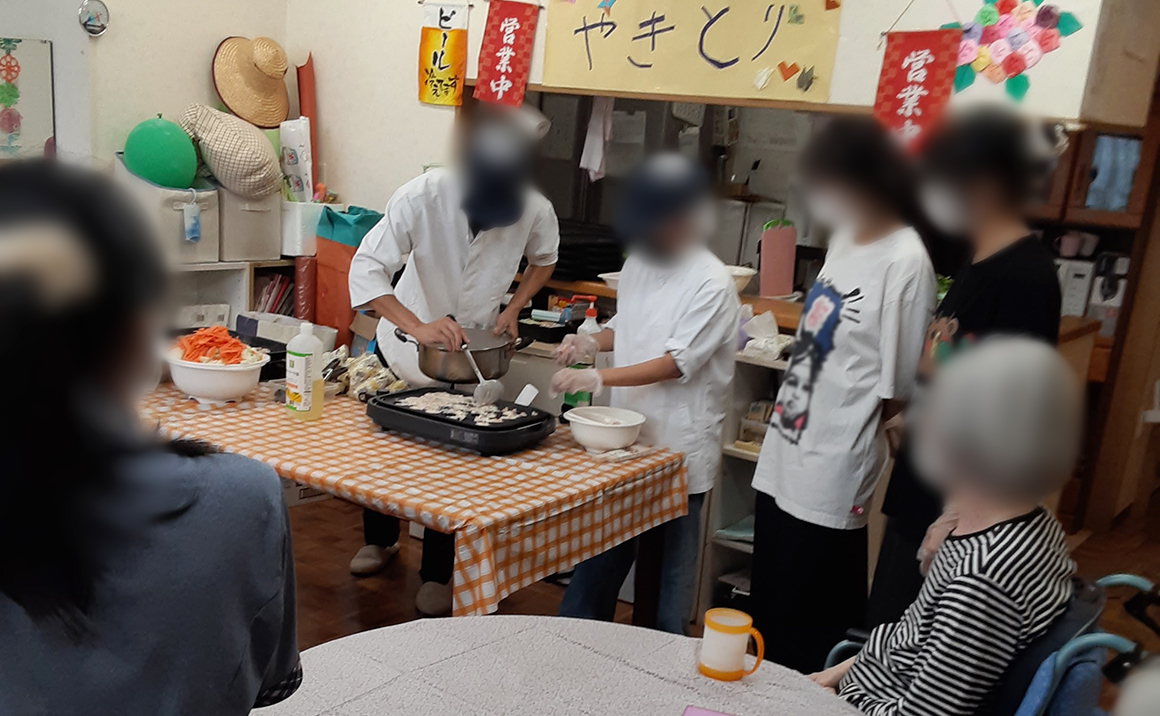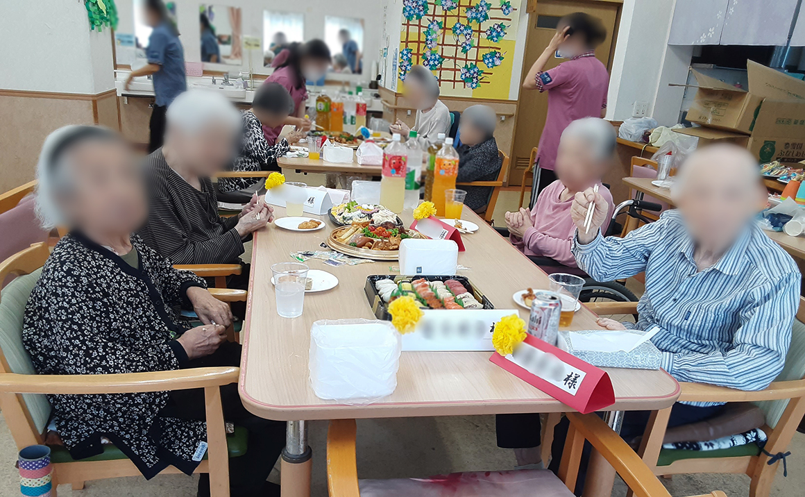 近隣には武蔵野の緑あふれる3つの公園があり、四季折々の樹々を愛でながらお散歩を楽しんでいただくことができます。地域交流も盛んで、公園で開かれる夏祭りにもお誘いいただき参加しております。敬老会の日には、よさこい祭りのボランティアの方々が施設に来て下さり踊りを披露して下さいます。参加して下さった方からは「こんなに近くで見れて、一緒に踊れるなんていいですね!」とご好評をいただいております。ホームイベントなどを通して、皆様が楽しく笑顔でお過ごしいただけるようにサポートする他、定期往診による健康管理はじめ医療機関と密な連携をおこなっており、緊急の際も迅速に対応する体制が整えられております。季節ごとのメインイベントは勿論、バイキングや鉄板焼き、喫茶店など、 日ごろからスタッフが色々な企画をして、楽しみに満ちた毎日を過ごしていただいている明るく笑顔の絶えないホームです。