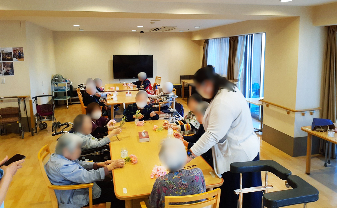 毎月の行事では、季節感を感じていただける行事の実施はもちろんのこと、その他にもファミリーコンサートや、日帰り旅行など、様々な活動のご提案を行っております。ドッグトレーニングセンターから介助犬を招き、触れ合っていただくドッグセラピーや、フラワーアレンジメントなども実施し、飽きの来ない活動を心掛けております。
