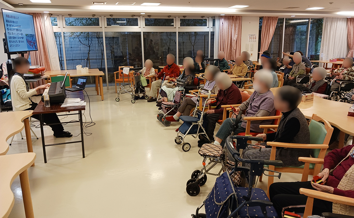 レクリエーションが充実しており、カラオケ、音楽療法などの歌レクリエーションから書道や料理、また毎週木曜日に近隣の鍼灸師による全体体操を実施しています。