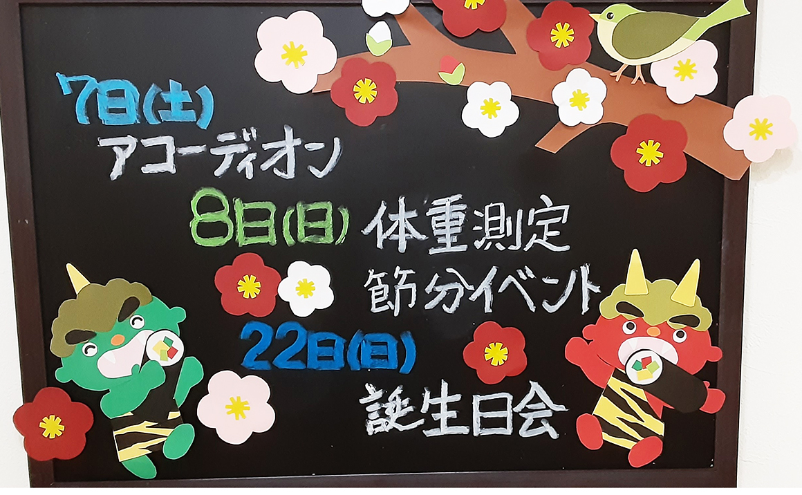 当ホームでは、リハビリに力を入れており、週3回の集団リハビリ・週2回の個人リハビリをプログラムに入れて、スタッフが実践しております。専属のPTによるプログラムメニューの計画・評価をして頂き、ご入居者様の残存機能を維持に向けて活動しております。閑静な住宅街の一角にあるアットホームな施設です。全室個室で、室内のレイアウトは自由に配置して頂けるためご自宅感覚で生活していただけます。フロアごとの談話室はフリースペースとしてお楽しみください。