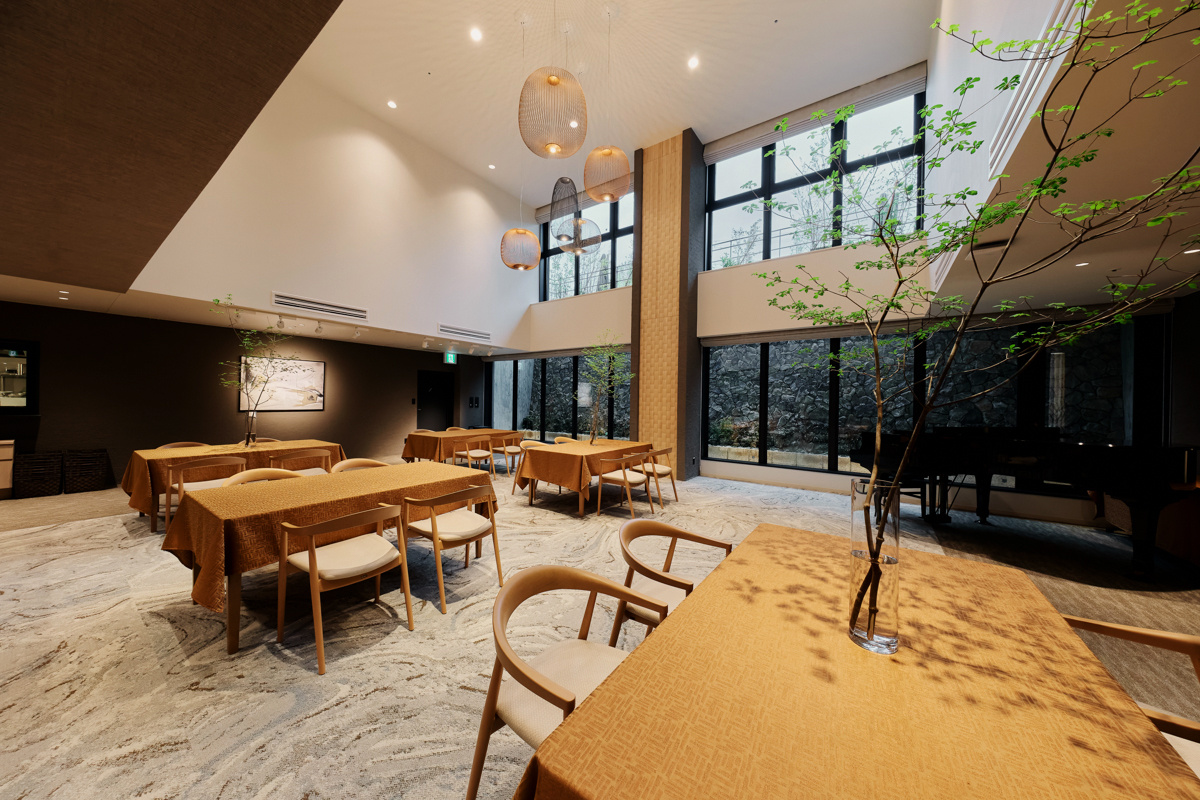 レストランは天井が高く、和と洋のデザインが融合。席は自由に選べるスタイルで、気分や体調に合わせてゆったりと食事が楽しめます。